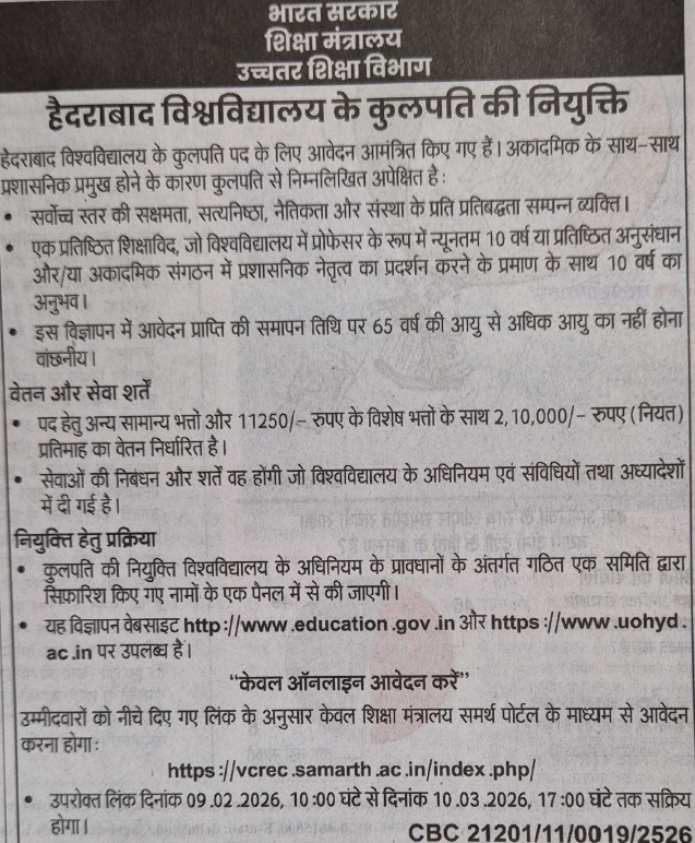 Advertisement for the “Appointment of the Vice Chancellor of University of Hyderabad" | Advertisement (Hindi and English) | Advertisement (Hindi)_Poster | 09-02-2026 16:54 | Download | 484.2 KB | |||||||